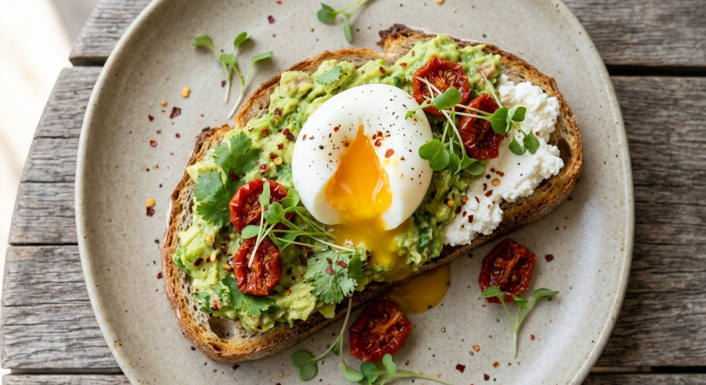 AED58Protein-packed classic: a hearty slice of toasted country bread, layered with fresh guacamole, a perfectly cooked egg, and creamy ricotta. Finished with sun-dried tomatoes and a sprinkle of fresh greens.