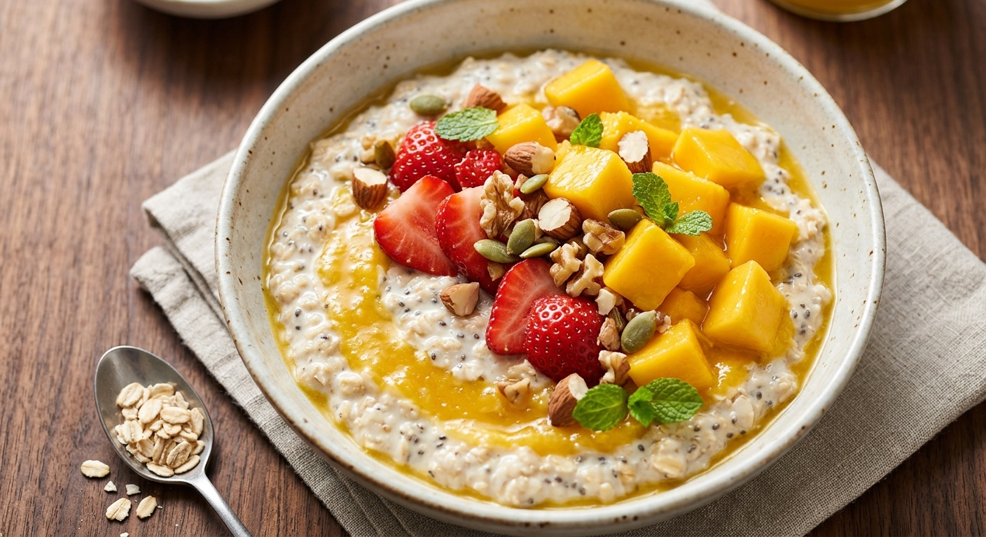 AED38Your new favorite, loaded with fiber and healthy fats: creamy overnight oats infused with chia, topped with juicy mango, crunchy mixed nuts, and sweet strawberries.