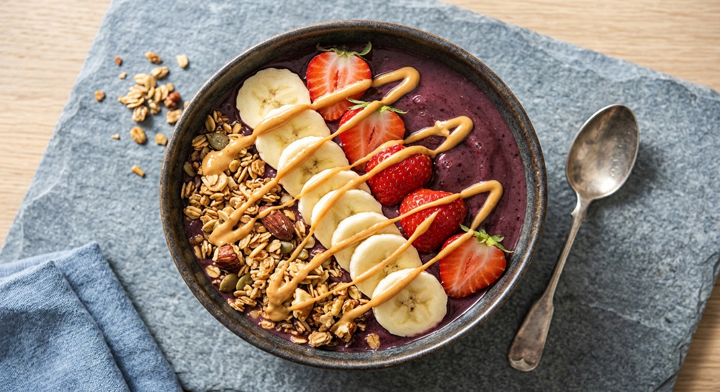 AED48A healthy superfood, bursting with antioxidants: blended acai berries, topped with sliced banana, fresh strawberries, crunchy granola, and peanut butter.